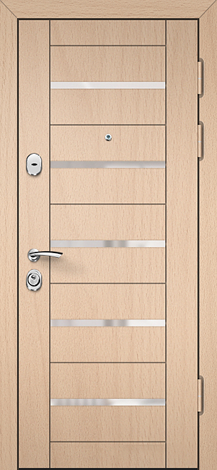 Эта бронированная дверь в современном дизайне №28 станет отличным решением для частного дома, квартиры или офиса, предлагая надежную защиту и стильный внешний вид. Ее конструкция включает каркас из профильной трубы 50х25 мм и металлическое полотно толщиной 2 мм, что обеспечивает прочность и долговечность. Внешняя и внутренняя отделка выполнены из плиты МДФ, придающей двери современный вид и стойкость к механическим повреждениям. Хотя терморазрыв отсутствует, конструкция с терморазрывом коробки и полотна помогает снижать теплопотери. Дополнительную безопасность обеспечивают два замка — сувальдный и цилиндровый, оба с тремя ригелями. В дверь можно добавить зеркало, стеклопакет или кованые элементы, а также установить видеодомофон, что делает эту модель максимально универсальной и индивидуальной. Бронированная дверь в современном дизайне №28 от производителя: быстрое изготовление и монтаж в Фряново, индивидуальные размеры, широкий выбор материалов и фурнитуры, официальная гарантия до 10 лет.